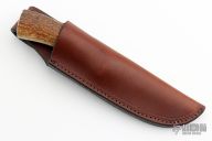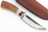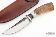 This fixed blade by Mike Malosh features a stag handle with black/aluminum/red spacers. Stainless steel guard and satin finish blade with forge finished flats, .179" blade stock and 1.139" blade depth. Includes a brown leather sheath with belt loop. New from maker at the 2023 Blade Show.