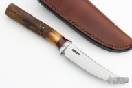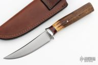 This fixed blade by Mike Malosh features a stag handle with black/aluminum/red spacers. Stainless steel guard and satin finish blade with .163" blade stock and .880" blade depth. Includes a brown leather sheath with belt loop. New from maker at the 2023 Blade Show.