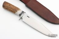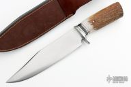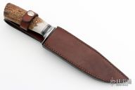 This fixed blade by Mike Malosh features a stag handle with black/aluminum spacers. Stainless steel guard and satin finish blade with .168" blade stock and 1.675" blade depth. Includes a brown leather sheath with belt loop. New from maker at the 2023 Blade Show.