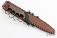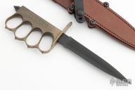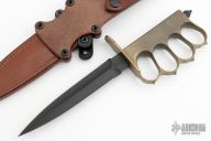 This Doughboy V2Trench Knife by Les George and Bawidamann Blades features a black Cerakote double edged blade with .187" blade stock, .995" blade depth, hidden tang construction. The handle has a cast brass knuckle guard grip with a skull crusher. Comes with a brown leather scabbard by Chattanooga Leatherworks. New condition.