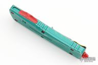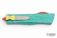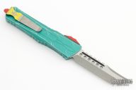 This Combat Troodon Bounty Hunter by Microtech Knives features a Hellhound tanto blade with fullers, satin flats and apocalyptic finished grinds. The handle has a green battle worn aluminum handle with red hardware, tip down apocalyptic finished stainless steel clip.  Includes the original box.  Excellent condition. Dated 02/2023 s/n 2974.