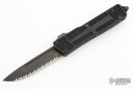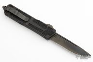 The Microtech Scarab II is a high quality tactical out-the-front knife, based on the original Microtech Ultratech design. Built to withstand the extreme, the Scarab II excels in high-intensity covert operations. The Scarab II is designed for a broad spectrum of utility and close quarter combat applications for use by qualified law enforcement, military, and government agency operatives. The Scarab II is fabricated to the highest possible standards to assure reliability and safety with its use. Featuring a one-handed, open and close, dual-action out-the-front (OTF) design, and fully serrated edge blade. The Scarab is produced with a large easy-to-grip handle that contains non-slip grip inlays on both sides. Comes with original box and papers. Excellent condition.