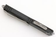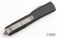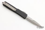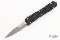 This knife from Microtech was the 2023 Blade Show Special. It has a double edged bayonet ground blade with an Apocalyptic finish. The handle is black frag pattern G-10 and black aluminum with a tip down Apocalyptic stainless clip and glass breaker at the butt. Comes with an original box and papers. New from maker at the 2023 Blade Show.
