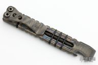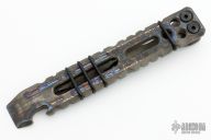 This prybar by Tim Miller is made from 6AL4V Titanium, it is .275" thick, has rubber o-rings holding in a phillips/flathead bit and a 1/4" hex driver for the bit, bottle opener, has lanyard holes and a titanium clip. Comes with COA. New from maker at the 2023 Blade Show.