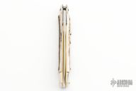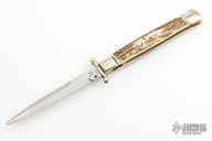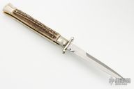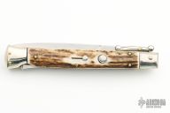 This Swing Guard Auto by Latama features a polished blade with a false top edge. Nickle silver guard and rear bolster and stag scales. Nice function, strong firing and lock up. Excellent condition. Comes with a zippered case.