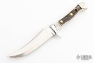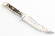 This skinner by Puma features a satin finished upswept blade with false top edge, notched thumbrest and a full tang construction, .129" Blade stock, 1.155" blade depth.  The handle has an aluminum guard and stag scales with brass/nickel silver rivets, and nickel silver rear bolsters. Includes original box, papers and brown leather sheath. Basically as new condition. Made in 1971