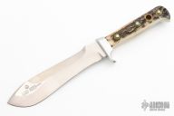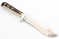 This White Hunter by Puma is the ultimate outdoorsman’s knife, originally designed by African professional hunters. It features a curved blade for cutting, slicing and skinning and a strong back edge for hacking. Handmade by skilled craftsmen with stag scales. Comes with original brown leather sheath, box and papers. Excellent  condition. #20681 on guard. Made in 1986