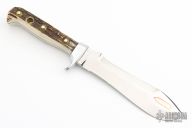 This White Hunter by Puma is the ultimate outdoorsman’s knife, originally designed by African professional hunters. It features a curved blade for cutting, slicing and skinning and a strong back edge for hacking. Handmade by skilled craftsmen with stag scales. Comes with original brown leather sheath, box and papers. Excellent  condition. #49392 on guard. Made in 1993