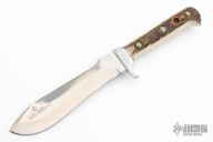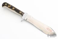 This White Hunter by Puma is the ultimate outdoorsman’s knife, originally designed by African professional hunters. It features a curved blade for cutting, slicing and skinning and a strong back edge for hacking. Handmade by skilled craftsmen with stag scales. Comes with original brown leather sheath, box and papers. Excellent  condition. #20681 on guard. Made in 1986