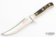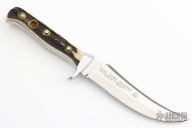 This skinner by Puma features a satin finished upswept blade with false top edge, notched thumbrest and a full tang construction, .133" Blade stock, 1.183" blade depth.  The handle has an aluminum guard and stag scales. Includes original box, papers and brown leather sheath. #40482 Excellent condition. Made in 1984