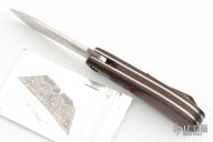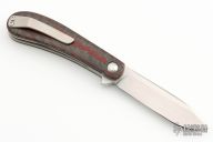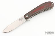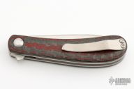 This Backpocket flipper from Doc Shiffer features a hand rub satin finished blade with fileworked thumbrest and a flipper. The handle has red/black carbon fiber scales, satin finished titanium liners, carbon fiber backspacer, and a tip up titanium clip. The blade is centered when closed and locks up with no play, nice detent. Has a couple very light scratches, otherwise excellent condition. Comes with original case.