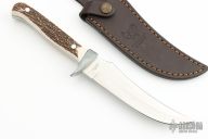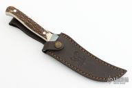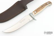 This Skinner from Hen & Rooster features a polished clip point blade with false top edge and notched thumbrest, .130" blade stock and 1.243" blade depth, full tang construction . The handle is comprised of an aluminum guard, stag scales. Includes original brown leather sheath with belt loop. Has a few light scratches, otherwise excellent condition.