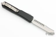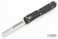 This Ultratech by Microtech Knives features a stonewashed Hellhound Razor blade with satin flats and false top edge. The handle has a black aluminum frame with tip down blasted stainless steel clip and hardware. Comes with original box and papers. 11/2022, S/N 140. Excellent condition.
