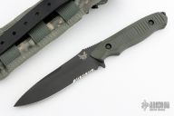The sleek, the Benchmade Nimravus signifies Benchmade's first fixed blade offering in several years. The Nimravus was styled by designer Allen Elishewitz to appeal to Benchmade customers who wanted a lot of the same features, materials and styling traditionally found with Benchmade folders except in a fixed blade format. As you can see it has a very good utility blade shape, and will perform equally well in a diverse selection of uses. Although not a geometric Tanto shape, this modern tip design is among the strongest configurations available today.