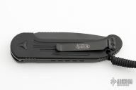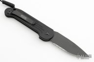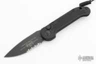 This LUDT side opening automatic by Microtech has a black blade with a partially serrated edge and a black aluminum frame. This tactical version has black fittings. Stainless steel clip. Dated 09/2022 and serial number 27513. Comes with original box. Excellent Condition.
