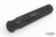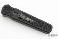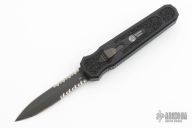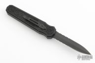 This Harkins Triton OTF Auto has a black double-edged partially serrated blade. The handle is black aluminum with non-slip inserts and black finished tip down clip. Comes with original box, papers, and sheath. Excellent condition.