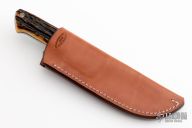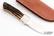This Nesmuk by Marcus Lin features a mirror finished upswept blade with full tapered tang construction. Blade is .196" thick and 1.116" deep. Stainless steel guard and Sambar stag scales with red liners and lanyard hole. Comes with leather sheath. Excellent condition.