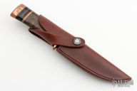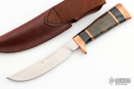 Blade: A trailing point Skinner, this blade is a timeless companion for hunters young and old. The high height hollow grind offers exceptional slicing performance with a fine tip for detail work. A large, unsharpened ricasso allows for a close grip for added control.
