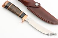 Handle: The blade is construction in a classic, stacked style with figured Walnut at the center and Buffalo Horn toward either end with raw copper fittings and spacers. Expanding toward the pommel, the neutral handle design offers a secure and comfortable grip that is well-balanced thanks to the heavy copper pommel end. A generous finger guard keeps the fingers safe from the blade.