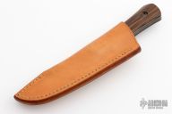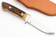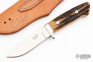 This Loveless Style Drop Hunter by Chad Nell features a mirror polish blade with .171" blade stock, .1016" blade depth, full tapered tang construction. The handle has a stainless steel guard, red fiber liners, and stag scales, lanyard hole at the butt. Excellent work. Comes with a brown leather sheath. Excellent condition.