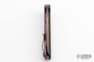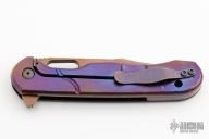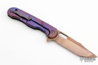 This Tac 45S by Jeremy Horton and Gerry McGinnis features a tumbled and bronzed chisel ground blade with fuller, thumbhole, notched thumbrest and flipper. The handle has a carbon fiber front scale with anodized and tumbled titanium lockside, mokuti backspacer, tip up anodized titanium clip, anodized titanium hardware. Mokuti shield inlay. Rides on bearings, nice detent, lockup and blade seating. #012 and dated 01-202. Has a couple light scuffs, otherwise excellent condition.