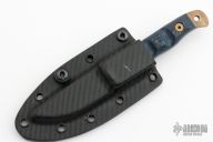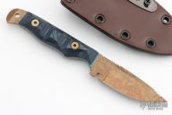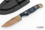 This Handyman by Dawson Knives features an Arizona Copper finished blade with notched thumbrest, .138" blade stock and .942" blade depth, full tang construction. The handle has blue/black G-10 scales with blue liners. Comes with a kydex sheath and original box and papers. Excellent condition. #098