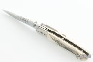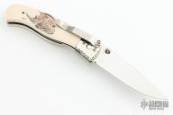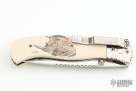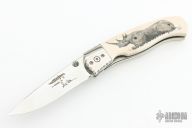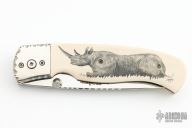 This liner lock folding knife by Gil Hibben features a mirror polish blade with fileworked spine and dual thumbstuds. The handle has mirror polished stainless steel bolsters with fileworked edges, fileworked stainless steel liners, mammoth ivory scales with "Rhino" scrimshaw by "Hutch" Hutchings dated '02. Has a couple light scratches, otherwise excellent condition.