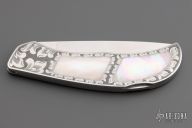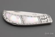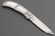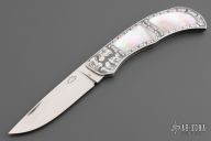 This Interframe lockback folder from Jack Busfield features a hand rub satin finished blade with nail nick. The handle is comprised of an engraved stainless steel frame with sea snail inlays and stainless steel lock spring. Has a couple light scratches, otherwise excellent condition. The handle has been engraved by S. Lytton.  Marked #001 on blade