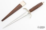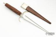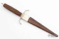 This Dagger by Charles Weiss has a mirror finished double-edged blade, .129" blade stock and .894" blade depth, hidden tang construction. The handle has a fileworked nickel silver guard and butt, spiral fluted walnut grip with nickel silver spacers. Comes with a matching nickel silver and walnut scabbard. Excellent condition.