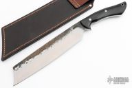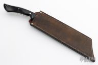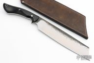 This Retribution by Lon Humphrey features a hand forged blade with satin finished grinds and forged finished flats, .250" blade stock and 2.043" blade depth, full tang construction. The handle has black micarta scales with stainless steel pins and lanyard tube. Comes with a brown leather sheath and original box. Excellent condition.