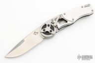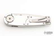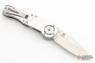 This is a knife from the GH-Series Gearhead folding knife by Mantis Knives. The "steampunk-style" Gearhead liner lock folder is equipped with a unique gear-driven pivot with one large gear, three small gears and a thumb lever used to deploy the blade when pushed down. It features a flat 3.38" plain edge tanto blade and measures just under 5" when closed. The gray handle scales are made from aluminum with a stainless steel backspacer and tip-up pocket clip. The GH2018TS Gearhead comes in a satin finished blade but is available in a variety of styles and finishes.
