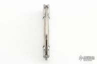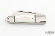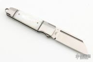 This Mini Butcher slipjoint by Andre De Villiers features a satin finished wharncliffe blade with fullers. The handle has a two-tone stainless steel frame, mother of pearl covers with a nickel silver escutcheon, stainless steel spring and lanyard hole at the butt. Has half-stop. Nice smooth function, lockup and blade seating. Comes with velcro pouch. Has a couple light scratches, otherwise excellent condition.