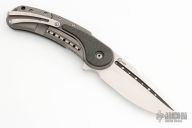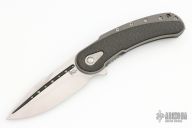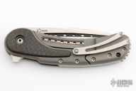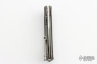 This Bodega flipper by Begg Knives features a satin finish blade and a bead blast titanium frame with carbon fiber inlays. "Cracked ice" titanium clip, backspacer, and pivot accent. Includes IKBS (Ikoma-Korth Bearing System) for smooth and fast opening that requires no wrist action. Extremely well crafted piece. One of the first marked Todd Begg USA. Comes with a zipper case. Excellent condition.
