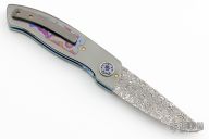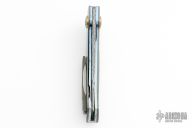This LL-X Front Flipper by George Muller features a Ladder Damasteel blade with a notched front flipper. The handle has zirconium scales black timascus inlays, anodized titanium liners, zirconium tip up clip and a stainless steel backspacer, gold plated screws. Features IKBS, nice detent, lockup, action and blade seating. New from maker. Comes with original box, zippered case and COA.