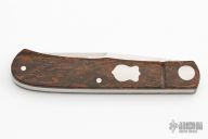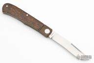 This slipjoing by Tommy Overeynder features a hand rub satin finished blade with false top edge and nail nick. The handle has vintage rag micarta covers, stainless steel escutcheon, pins and liners, stainless steel spring. Has half-stop, flush in all positions. Excellent condition.