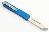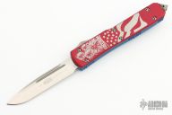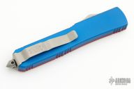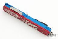 This Ultratech OTF automatic my Microtech Knives is the Freedom Edition. It features a standard drop point blade. The handle has an aluminum frame, red and blue, with a stainless steel clip. Excellent condition.