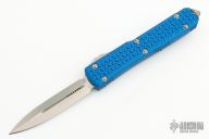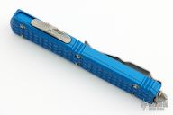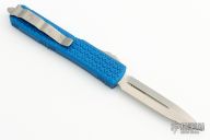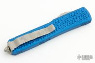 This Ultratech by Microtech Knives features a stonewash finished double edged blade with fullers. The handle is comprised of blue tri-grip aluminum with blasted hardware, thumb slide, pocket clip and glass breaker. Dated 08/2015 with a S/N of 57944. Excellent condition.