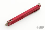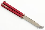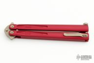 This Tachyon III balisong by Microtech Knives has a bronze finished blade with false top edge. The handles are integral red aluminum with spring latch and tip up stainless steel clip, all bronzed hardware. Dated 02/2017 and s/n 01498. Excellent condition.