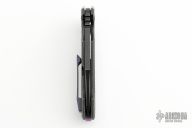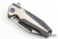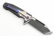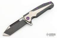 This ADV The Beast 2015 framelock flipper has a two-tone finished S35VN blade with dark stonewashed bevels, satin flats, notched flipper, thumbrest and a thumbhole. Handle has a satin and dark stonewash finished titanium frame, anodized titanium backspacer and two-tone tip up clip. Has stainless steel lockbar insert and lockbar stabilizer. Has anodized titanium hardware. Nice smooth action, detent, lockup and blade seating. Comes with a nylon zippered case. Has some light scuffs and scratches on the clip and frame, excellent condition otherwise.