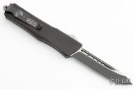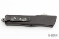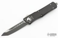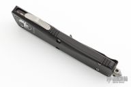 This Combat Troodon OTF automatic by Microtech knives features a black tanto blade, and a black aluminum handle with blasted hardware, tip down carry. Glass breaker. S/N 01841. Dated 02/2009. Comes with a Microtech box and papers, not original, and an invoice from its recent servicing at Microtech. Has some light scuffs and wear on the clip, otherwise excellent condition.