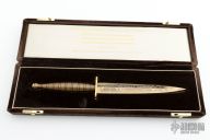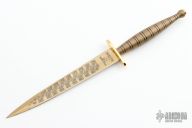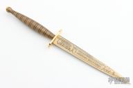 This USMC Marine Raider Stiletto by HG Long & Co and EK Knives features a double edged blade with etching in honor of the Battles of the Philippines, .180" blade stock and .934" blade depth, hidden tang construction. The handle has a gold plated guard and a brass grip. Comes with original box and papers. Excellent condition. #340 of 2500