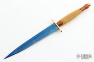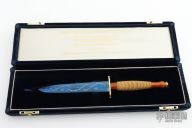 This USMC Marine Raider Stiletto by HG Long & Co and EK Knives features a double edged blade with etching in honor of the Battles of the Coral Sea, .180" blade stock and .934" blade depth, hidden tang construction. The handle has a gold plated guard and a twisted gold plated wire wrapped wood grip. Comes with original box and papers. Excellent condition. #340 of 2500