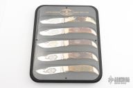 These Ka-Bar slipjoints are dated 1986 through 1990. They have nickel silver bolsters, stag, bone, wood, jigged bone and clear scrimshawed scales, brass liners, and stainless steel springs. Comes set in a display box. Excellent condition.