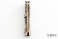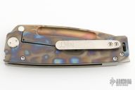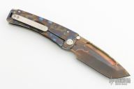 This Marauder by Medford Knives features a vulcan finished tanto blade with fullers. The handle has a tumbled and anodized titanium frame with a satin titanium skull crusher at the butt and tip up clip. Nice detent, lockup and blade seating. Comes with original box, case and papers. Excellent condition.