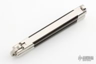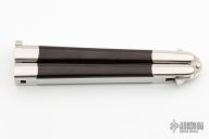 This early balisong from Pacific Cutlery features a Jody Samson ground satin finished blade with swedge. The handles are stainless steel with dovetail black linen micarta inlays, has t-latch. Has some light scratches otherwise the knife is in excellent condition.