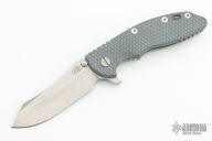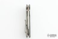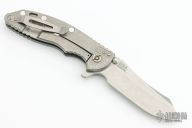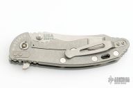 This XM-18 Skinner from Rick Hinderer Knives features a 3.5" blade, notched thumbrest and flipper, dual thumbstuds. The handle has a gray G-10 scale, and stonewashed titanium handle, tip up or down pocket clip, fuller tab and standoffs. Clip can be mounted for tip up or down carry. Nice lockup, seating, and detent. Excellent condition.
