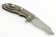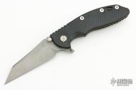 This Fatty XM-18 by Rick Hinderer features a working finished wharncliffe blade with notched thumbrest and flipper. The handle has a textured black G-10 scale, working finished titanium frame and clip, lanyard hole at the butt. Nice detent, lockup and blade seating. Excellent condition.