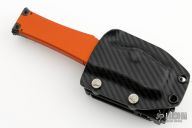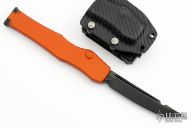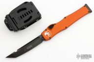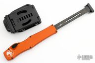 This Halo VI by Microtech Knives features an DLC finished tanto blade with notched thumbrest. The handle has a orange aluminum frame and DLC finished titanium charging handle. No safety. Comes with a kydex sheath with belt clip, original box and papers. Dated 12/2018 and s/n 032. Excellent condition.