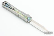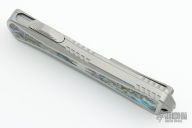 This Manticore X by Heretic Knives features a mirror polished tanto blade. The handle has a two-tone stainless steel frame with abalone inlays, stainless thumb slide and a tip down stainless steel clip. Comes with original box, zippered case and COA dated 8/210 and s/n 019. Excellent condition.