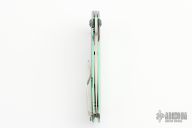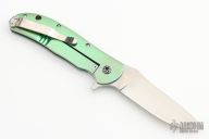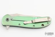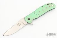 This framelock flipper by Gayle Bradley features a satin finished blade with flipper. The handle has an orange peel finished and anodized titanium frame with a fileworked tip up stainless steel clip. Nice detent, lockup and blade seating. Rides on bearings. Excellent condition. Comes with a zippered case.